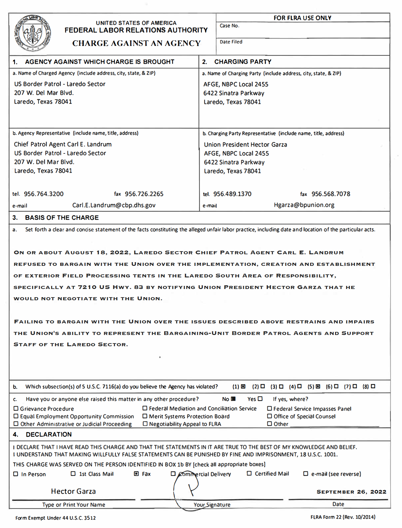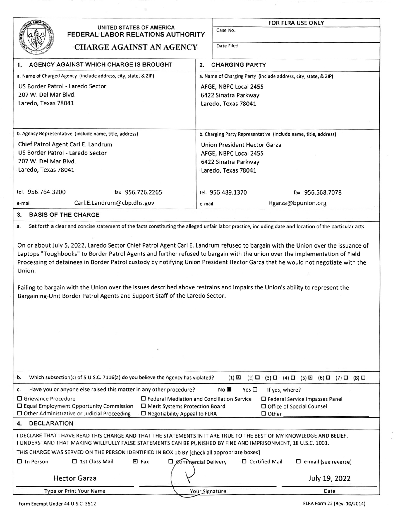 U.S. Border Patrol Laredo Sector Chief Patrol Agent Felix Chavez fails to protect Border Patrol Agents from COVID-19