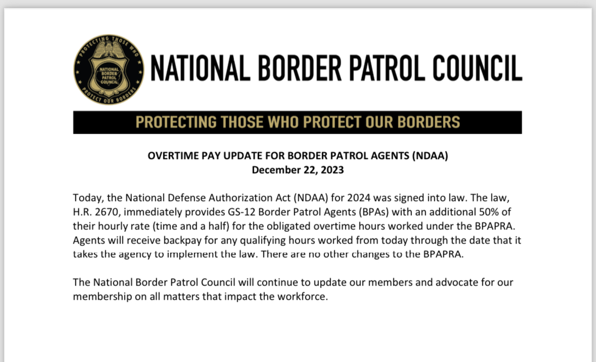 Congress passes overtime pay increase legislation for Border Patrol Agents