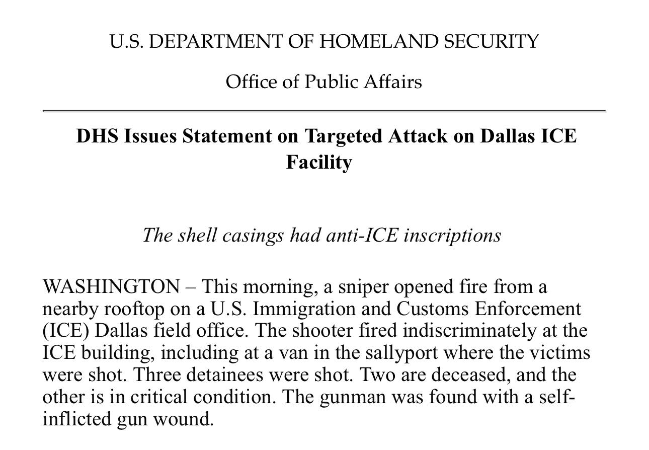 DHS Issues Statement on Targeted Attack on Dallas ICE Facility