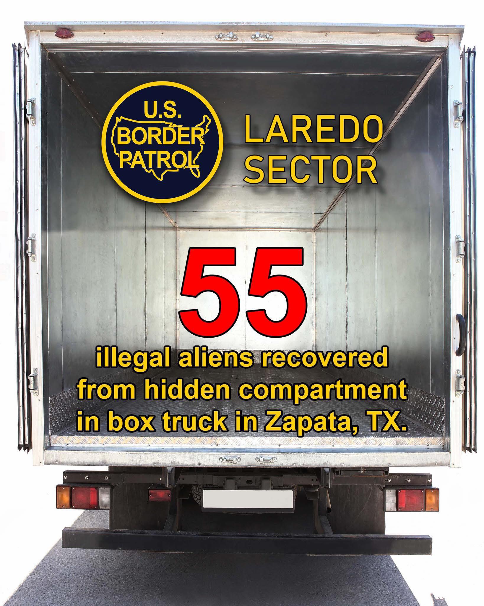 57 illegal aliens were arrested by Laredo Sector Border Patrol agents during a human smuggling attempt near Oilton, Texas.