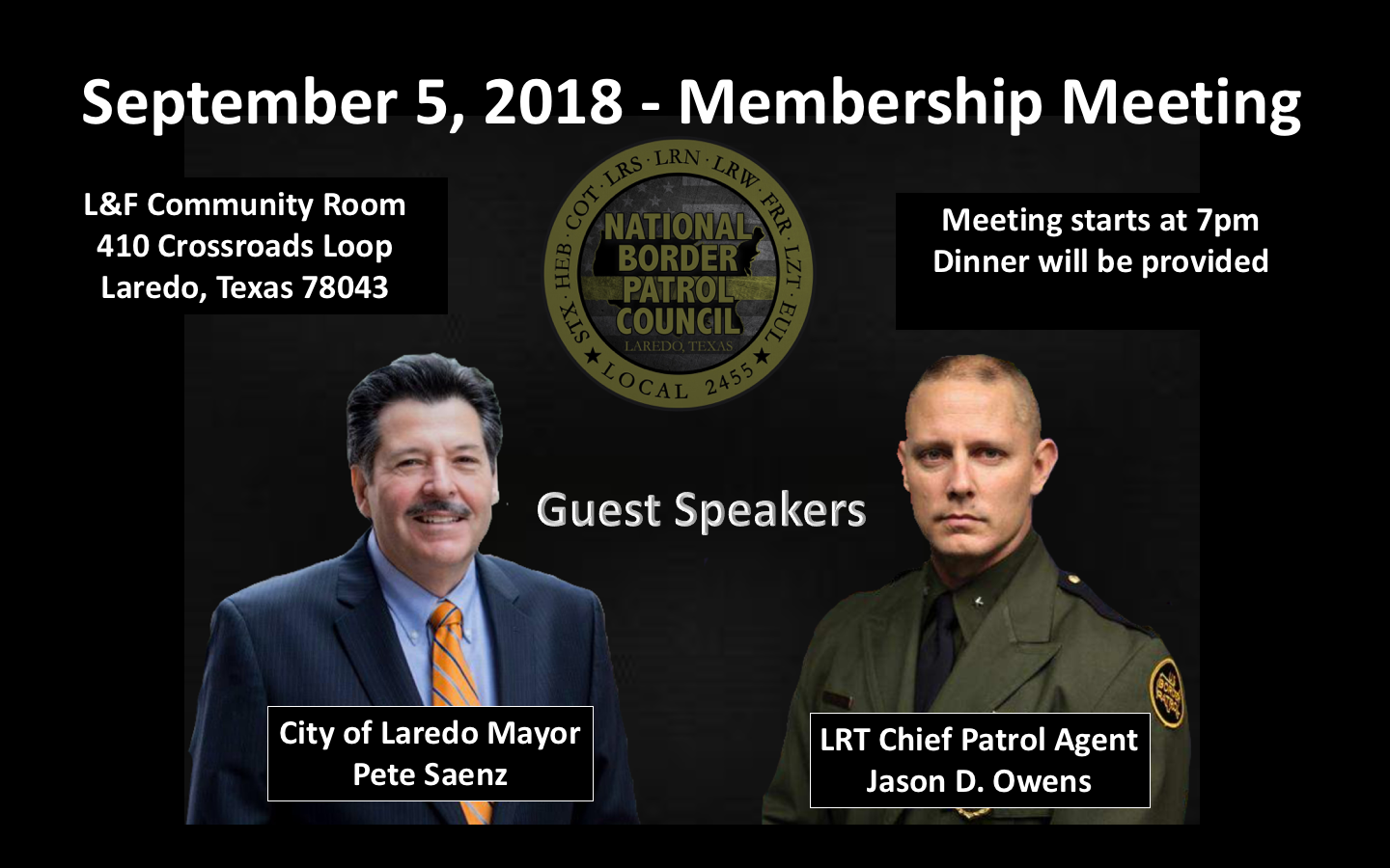 LRT Chief Patrol Agent Jason D. Owens and City of Laredo Mayor Pete Saenz to attend September 2018 Local 2455 Membership Meeting